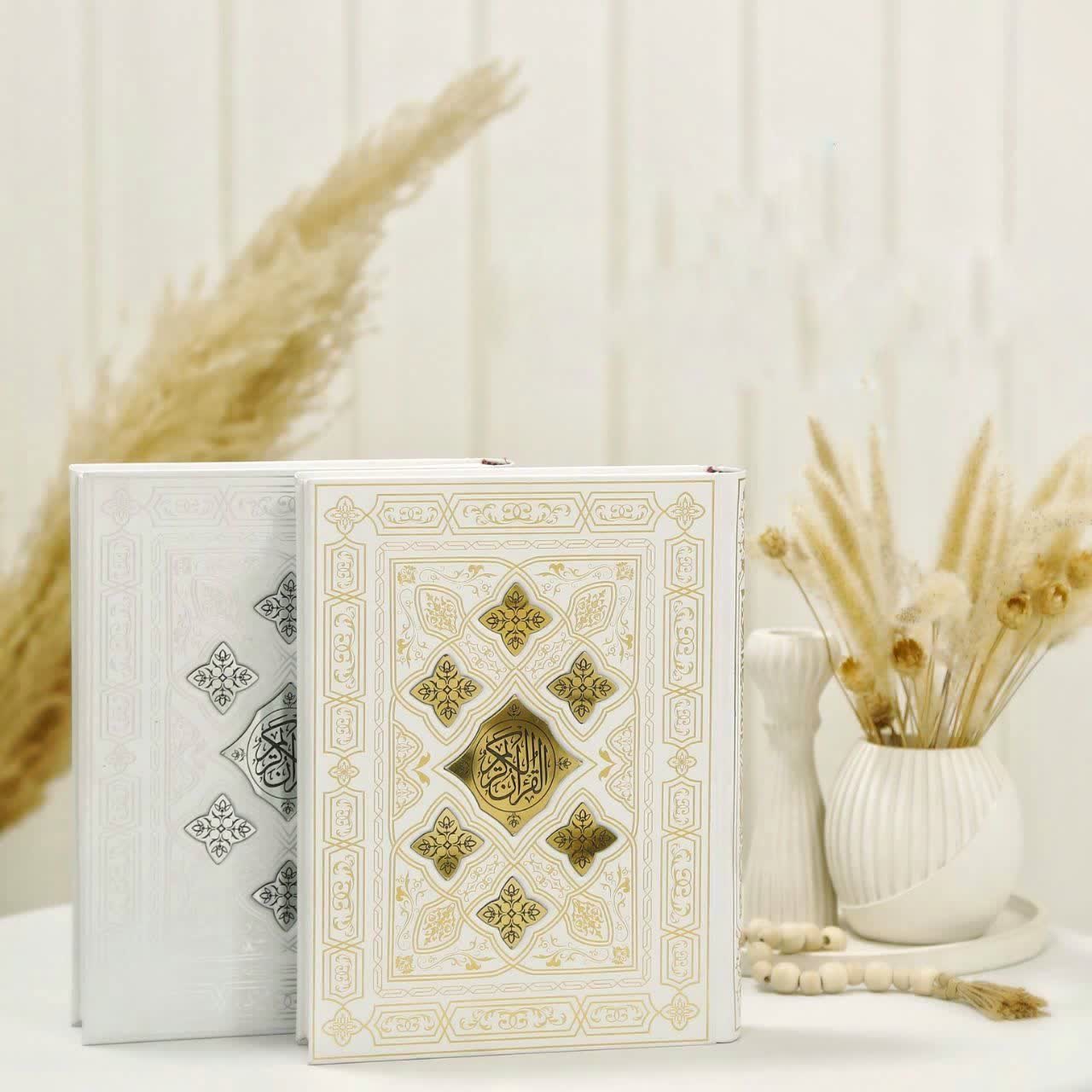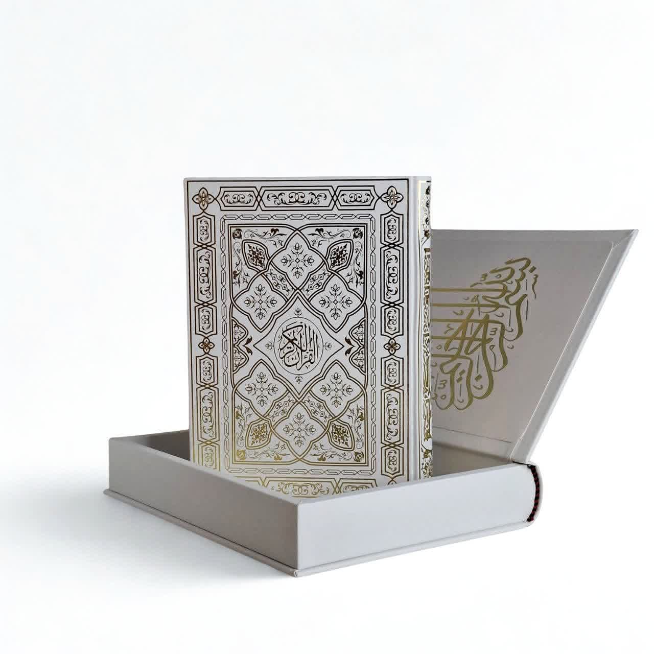 این قرآن زیبا با سایز وزیری و رنگ سفید شیک و جذاب، انتخابی خاص برای عروس و هدیههای معنوی است. همراه با قاب صندوقی محکم و زیبا، جلوهای فاخر و ماندگار دارد.9