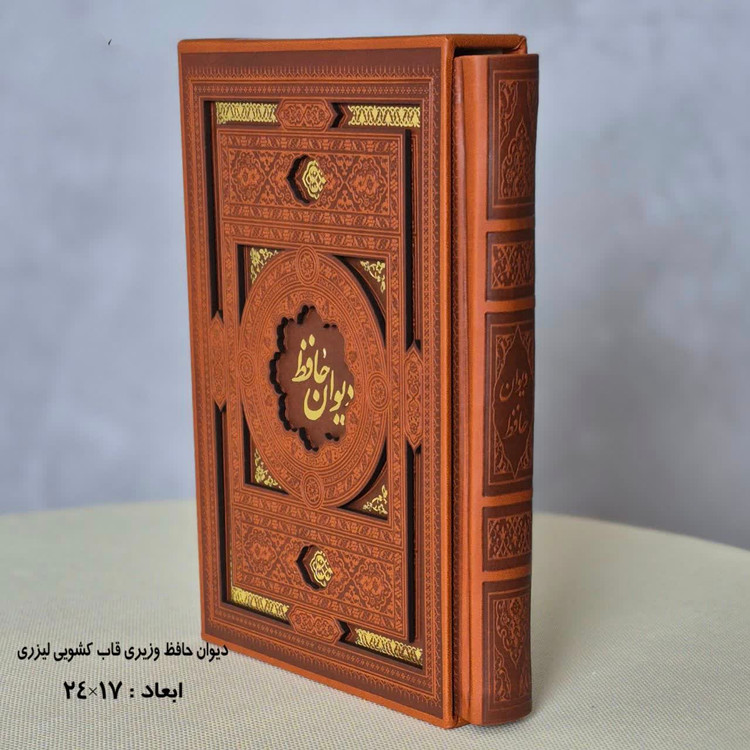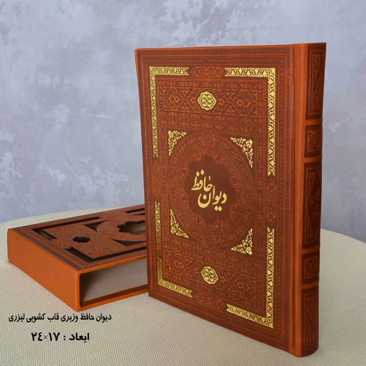 دیوان حافظ قابدار کشویی لیزری نفیس کاغذ گلاسه سایز وزیری ۲۴در۱۷چرم همراه با فالنامه و شرح عرفانی