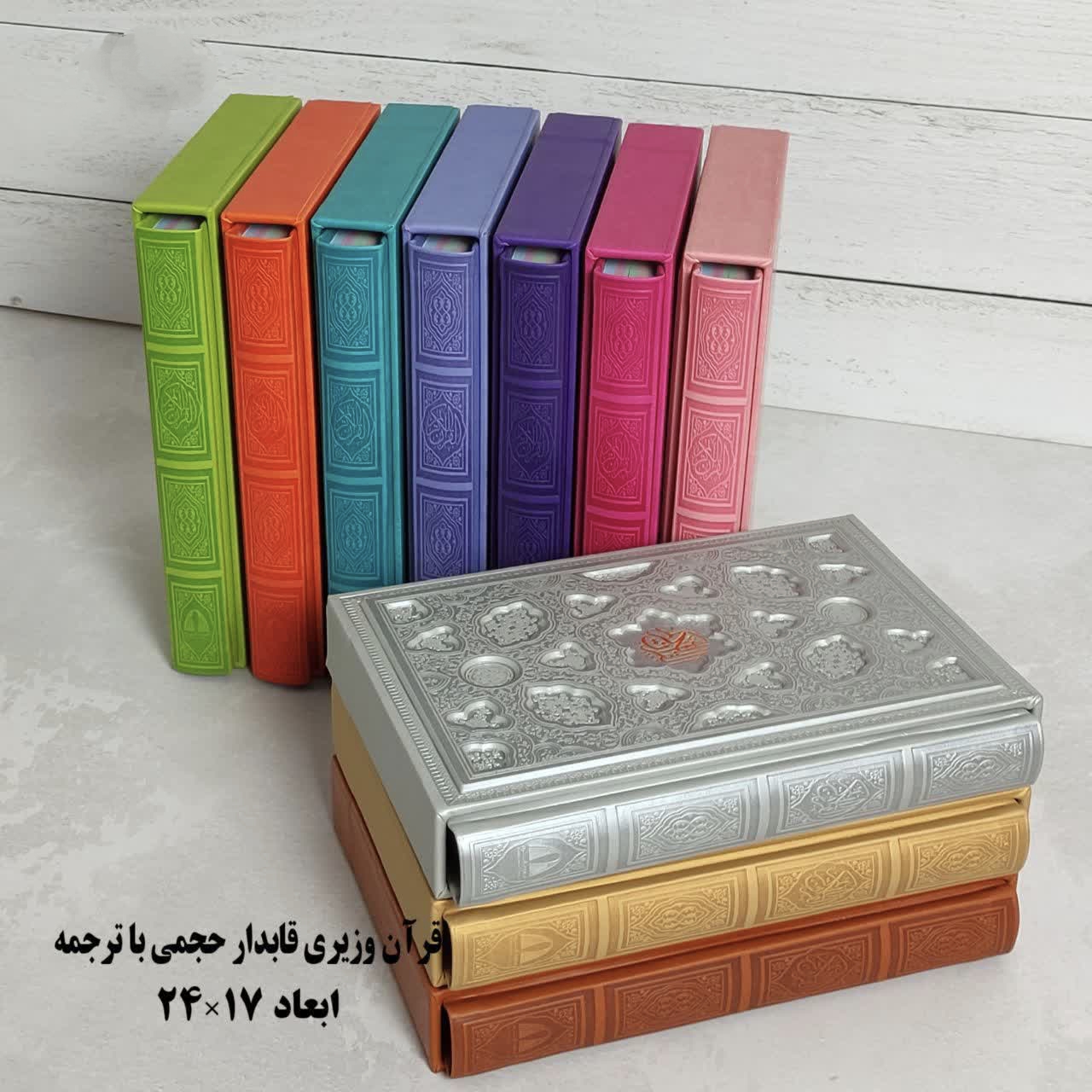 قرآن وزیری ترمو رنگی چرم قابدار کشویی حجمی خط عثمان طه ترجمه شیخ حسین انصاریان سایز وزیری 24*17 حاشیه رنگی