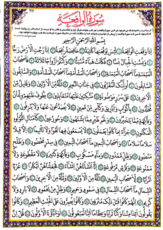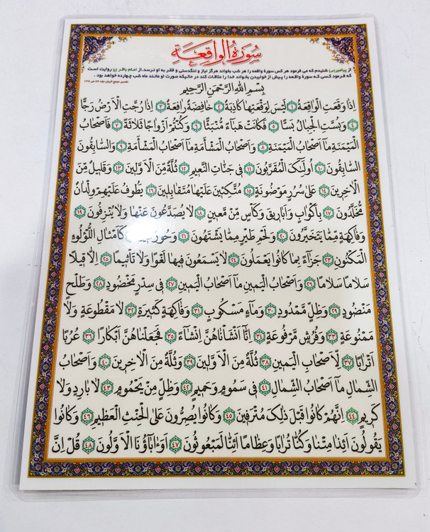 سوره واقعه تک برگی سایز a4پرسی لمینت شده خط درشت و خوانا